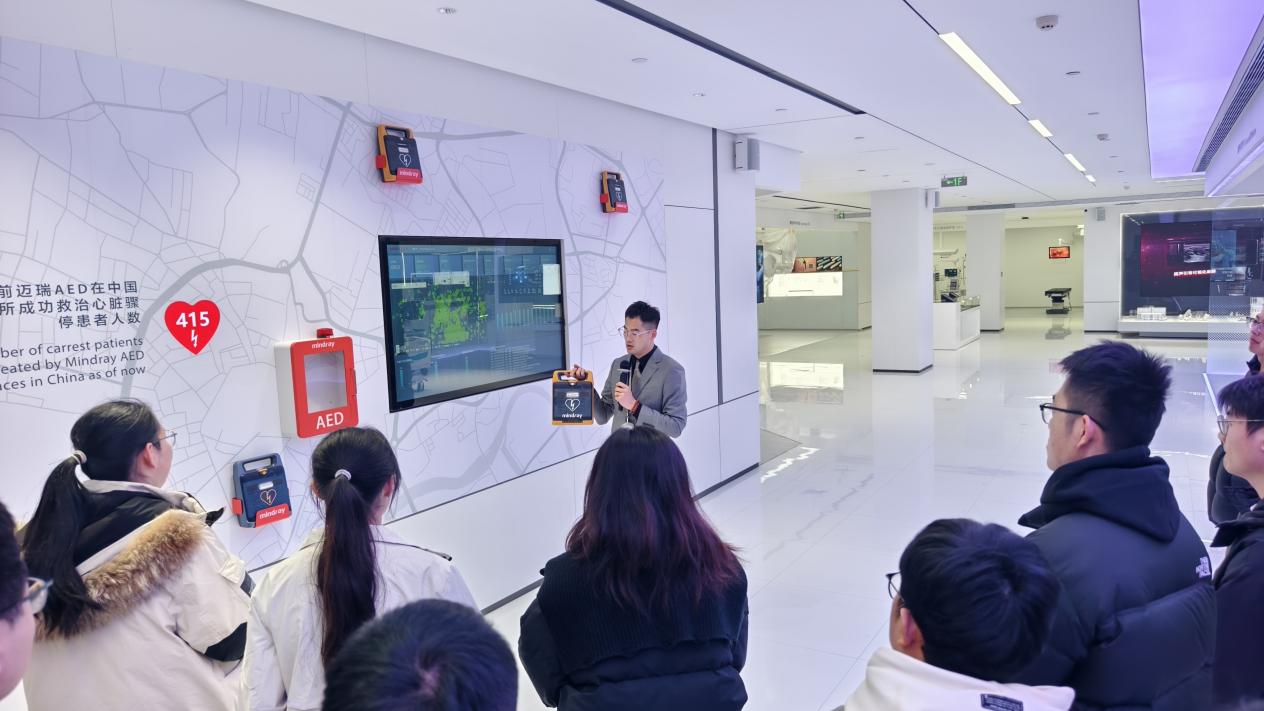 活动伊始,师生抵达迈瑞园区,在培训楼展厅及产线进行了实地参观。通过讲解员的详细介绍,大家系统了解了迈瑞医疗的发展历程、产业布局与产品体系。从多功能手术台、患者监测系统,到全自动无人生产线,同学们亲身感受到高端医疗装备的制造水平与技术创新实力。