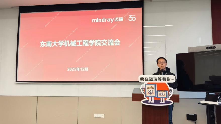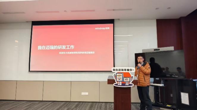 南京迈瑞生物医疗电子有限公司研发总监王文龙系统阐述了迈瑞的产品研发流程与创新体系,详细介绍了从需求洞察、概念设计到产品落地全过程的跨部门协作机制,并分享了公司在医疗设备智能化、国际化发展方面的战略布局。此外,他还就迈瑞的人才发展通道、技术与管理双通道晋升体系进行了说明,为同学们勾勒出清晰的职业成长路径。